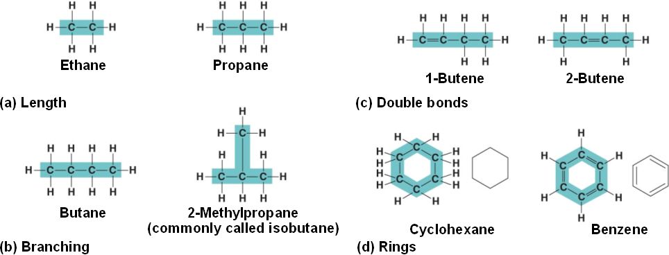 These hydrocarbons (molecules consisting only of carbon and hydrogen) illustrate the diversity of the carbon skeletons of organic molecules.