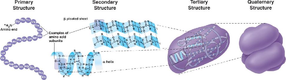 Most proteins fold into a specific 3-dimensional shape (conformation) with four levels of structure.
