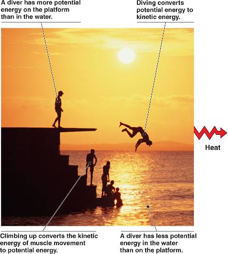 The potential energy is converted to kinetic energy when the object is in motion (as when the diver jumps off the platform).