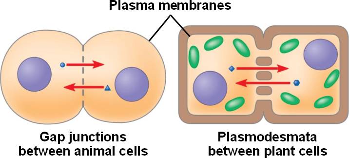 Animal cells have gap junctions where membrane proteins allow molecules to pass from one cell to another.