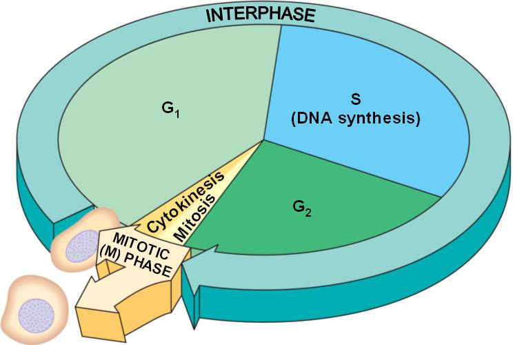 The mitotic (M) phase alternates with interphase, which is composed of 2 growth phases (G1 and G2) and a S (DNA synthesis) phase.