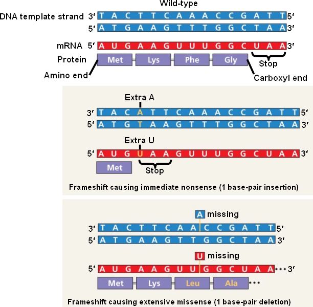 Base-pair insertions or deletions can cause frameshift in reading the codon,