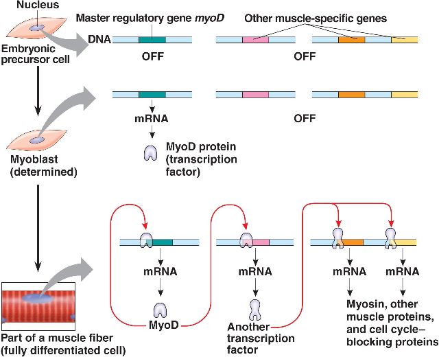 MyoD is a "master regulatory gene" whose expression commits the cell to becoming skeletal muscle.