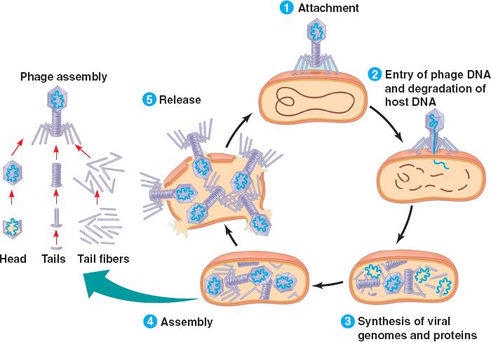 The lytic and lysogenic cycles of λ, a temperate phage.