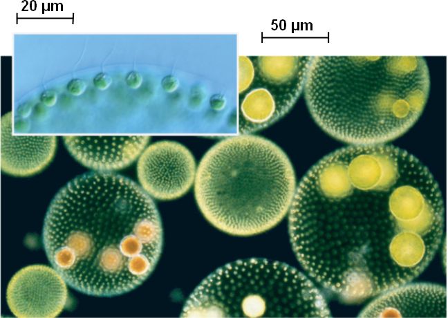 The colony wall is composed of biflagellated cells that cannot reproduce if isolated.