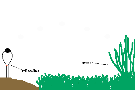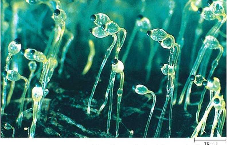 The mycelium bends its spore-bearing hyphae toward bright light, where grass is likely to be growing.